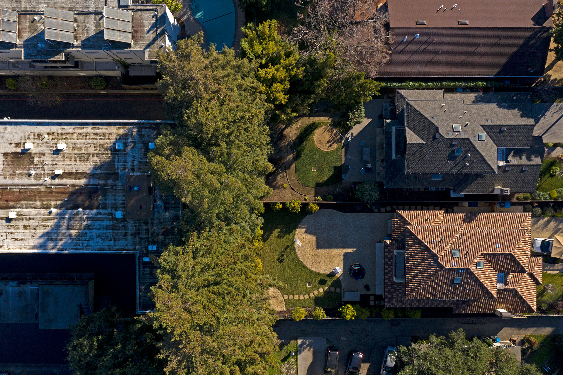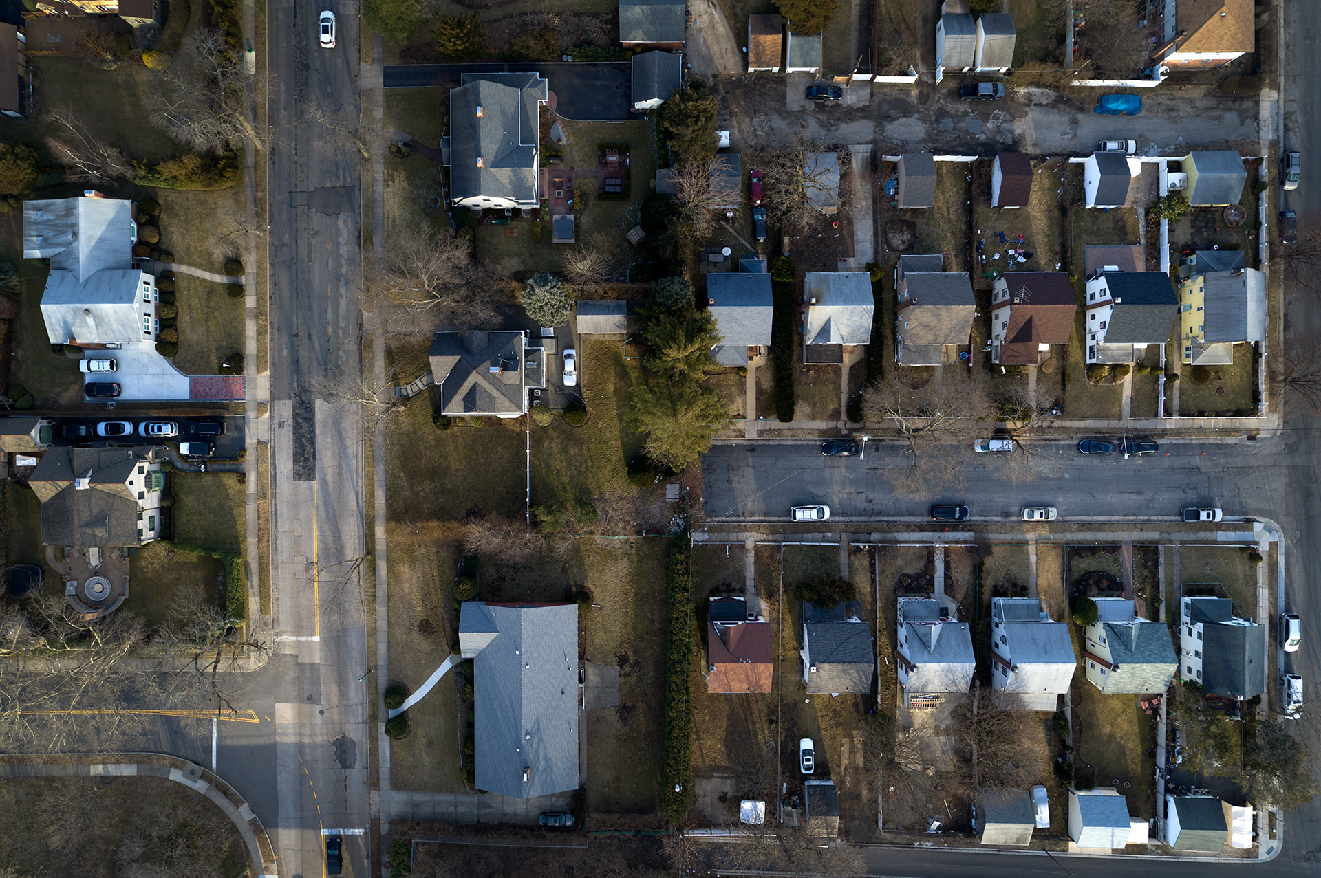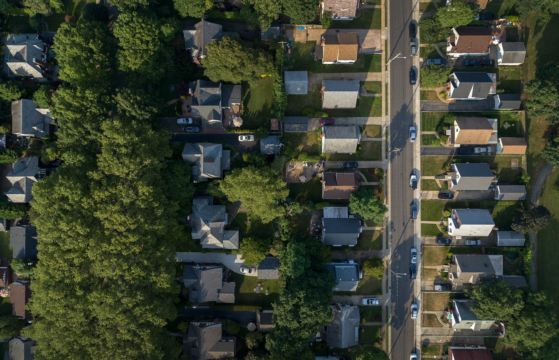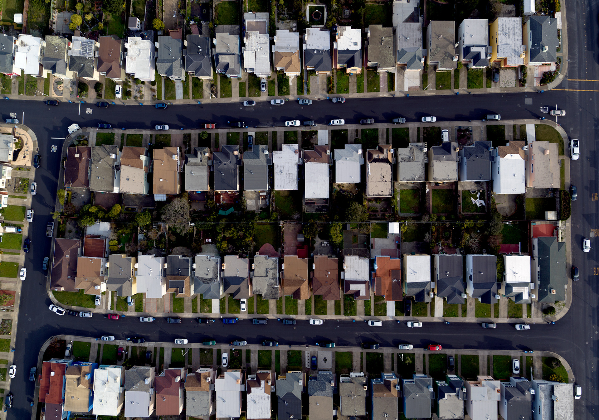 Racial differences in American communities are not simply a natural process of families moving in and out of neighborhoods, but a direct result of government policy. In 1934 the Federal Housing Administration created maps of every American city (above, center). Neighborhoods deemed risky -- mostly those with minority populations -- were “redlined,” meaning they weren’t eligible for new federally-backed mortgages. New construction and housing in green and blue areas often included a housing covenant, which explicitly restricted ownership to white families. These practices helped create the racially divided neighborhoods that still exist today. On Long Island, New York (top, right), Garden City and Hempstead border each other, but couldn’t be more different. Garden City, on the left of the image, is 90% white while Hemstead is 92% black and Hispanic. The median home in Garden City is valued at $812,000 versus $309,000 in Hempstead. Another view (bottom) of Garden City and Hempstead. A similar difference exists in California (top, left) between Menlo Park and East Palo Alto. Menlo Park is mostly white and has a median house value of $1.7 million, about three times that of mostly minority East Palo Alto.