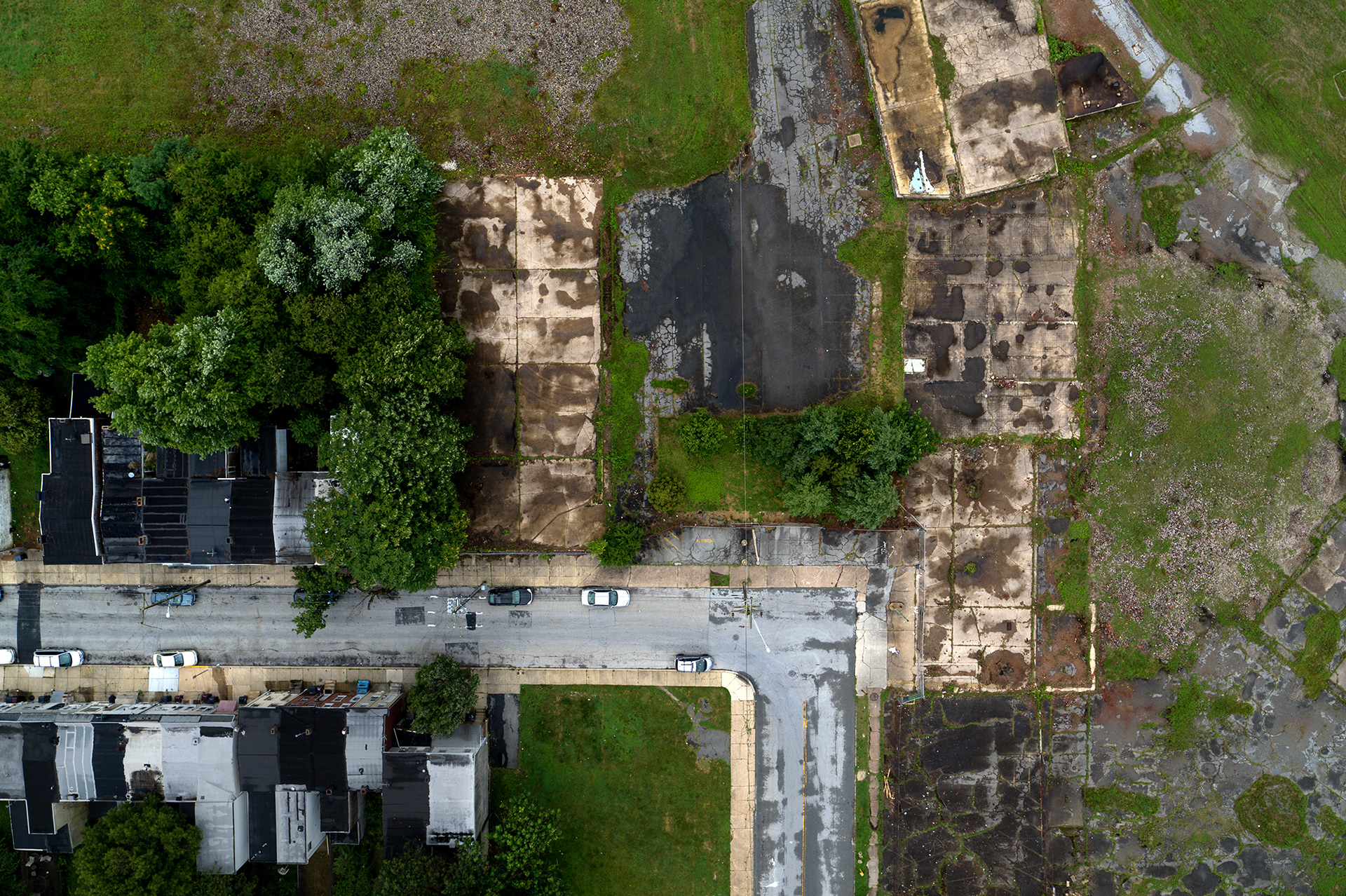 After the Federal Housing Administration redlined specific neighborhoods, investment slowed and values declined. At the same time, urban factories needed more space and largely left cities, fueled by the growth of the automobile and new highways. In the redlined Lower Bottoms neighborhood of Oakland (above), an abandoned lot is all that remains of the Phoenix Iron Works plant. The factory employed more than 100 people at its height in the 1960s. The remnants (below, right) of the Goetze Meat plant in Baltimore. A field and playground (below, left) is all that remains of a dense neighborhood of row houses in Johnston Square, a redlined neighborhood in Baltimore. The city is in the process of tearing down thousands of abandoned homes. Houses slated to be torn down (bottom) in the Sandtown neighborhood of West Baltimore, where a third of residents live in poverty.