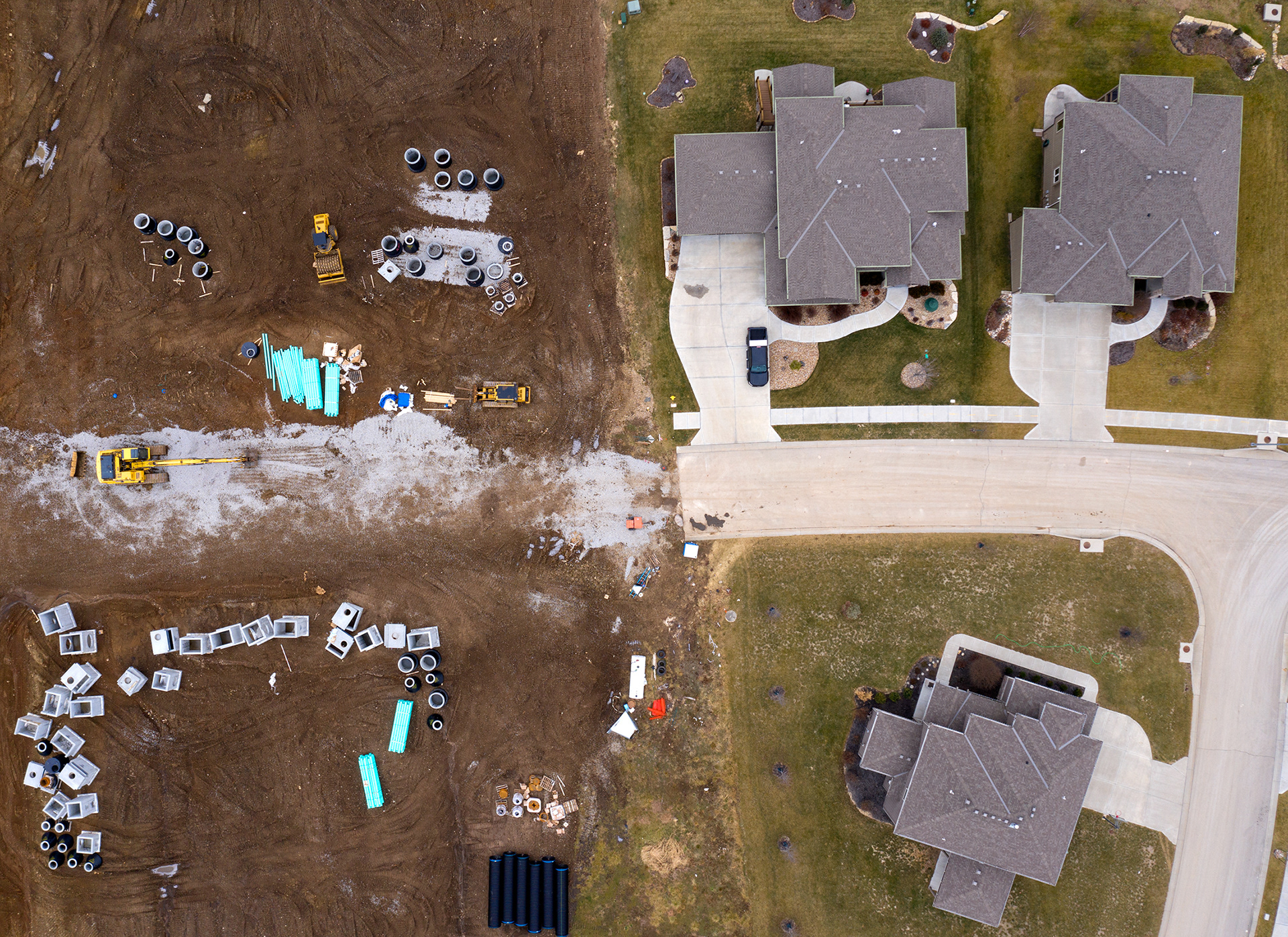 When they were originally built, the majority of suburbs in America restricted sales to whites. The most common method of discrimination was through housing covenants, passages in deeds that forbade current and future sales to minorities. Westlake (above) was built after World War II outside of San Francisco and is often compared to Levittown on Long Island. Both developments were originally white-only by design. Westlake is also the inspiration of the anti-conformity song “Little Boxes,” by Malvina Reynolds. A much more ambitious planned community 100 miles from Los Angeles, California City (bottom), was launched a little more than a decade after Levittown and Westlake. The experiment failed, leaving a largely intact suburban street grid in the Mojave Desert and just 14,000 remaining residents. New suburbs (below) sprout in Lee’s Summit, Missouri.
